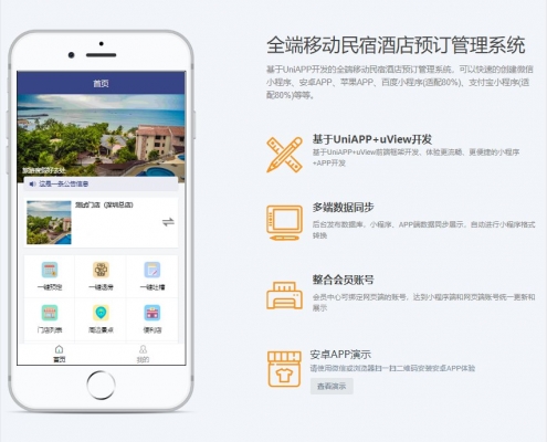 admin2021-10-29 01:53:452021-11-08 12:17:30全端移动民宿酒店预订管理系统的小程序、APP 包含一键预订、一键退房、一键WIFI、一键吐槽、周边信息等功能。